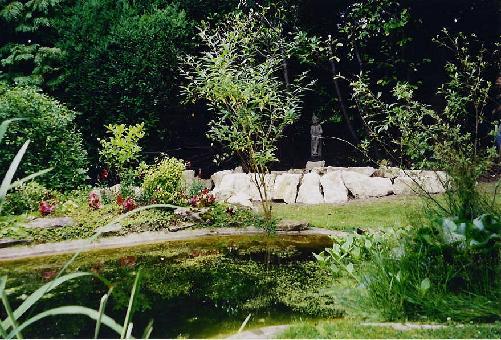 The beds bordering the drive complete - and looking across the pond to the first of the conifer beds