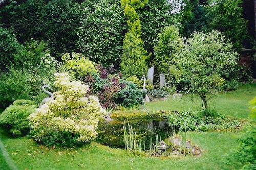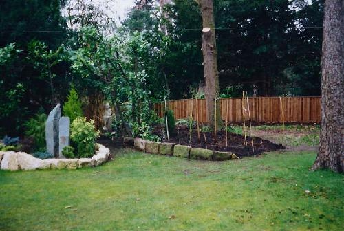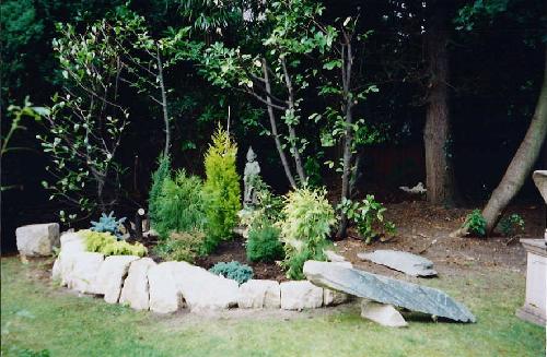 After setting the stone border of the new bed we placed the pixie in a small cleared glade. The remaining Laurels which had been pruned back hard can be seen in the foreground. We chose a selection of conifers varying in height, shape, colour and growth habit.