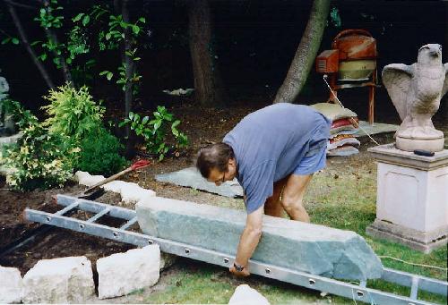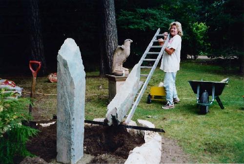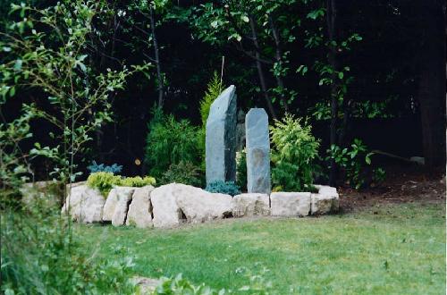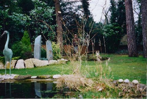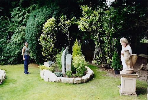 As a feature to this bed we selected two green granite monoliths - an idea we took from a show garden at The Hampton Court Flower Show. These were extremely heavy and needed to be rotated into an upright position with their bases set in concrete. The technique used was not dissimilar to that used by the ancient Egyptians to erect obelisks.