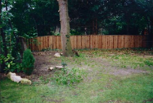 We chose taller, faster growing trees on the right-hand side of this bed to form a screen to obscure the boundary. We also planted a red-flowered Rhododendron and an Acer in this bed, which would give a glorious red colour in the Autumn.