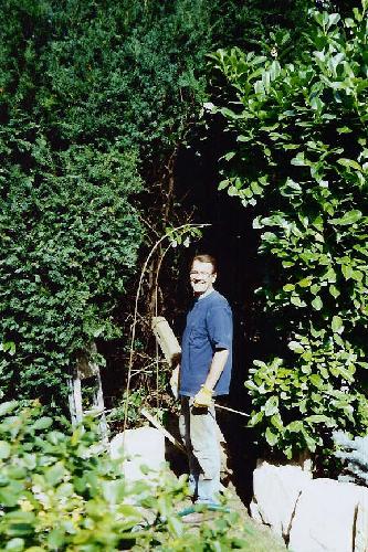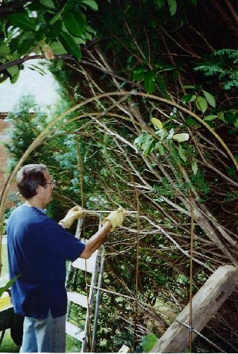 The tunnel was to be formed partly by one of the existing Laurels together with a Yew tree. A steel archway was made to provide a support so that eventually a tunnel would be formed leading to the pixie. The branches were tied in to cover the steel frame-work.