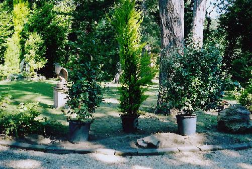 This part of the garden is dominated by mature Scots Pines. Over the year these have had the effect of rendering the soil very poor due to both the presence of their root structure and the fact that the shedding of their pine needles makes it rather acidic. There were a large number of Laurels which had become too large and 'leggy' that we decided needed to be cut down. The decision was to replace them with a number of conifer beds - and to improve the quality of the soil for the new planting these would be delineated by circles of large stones such that the area they circumscribed could be filled with a raised layer of new top soil and compost.